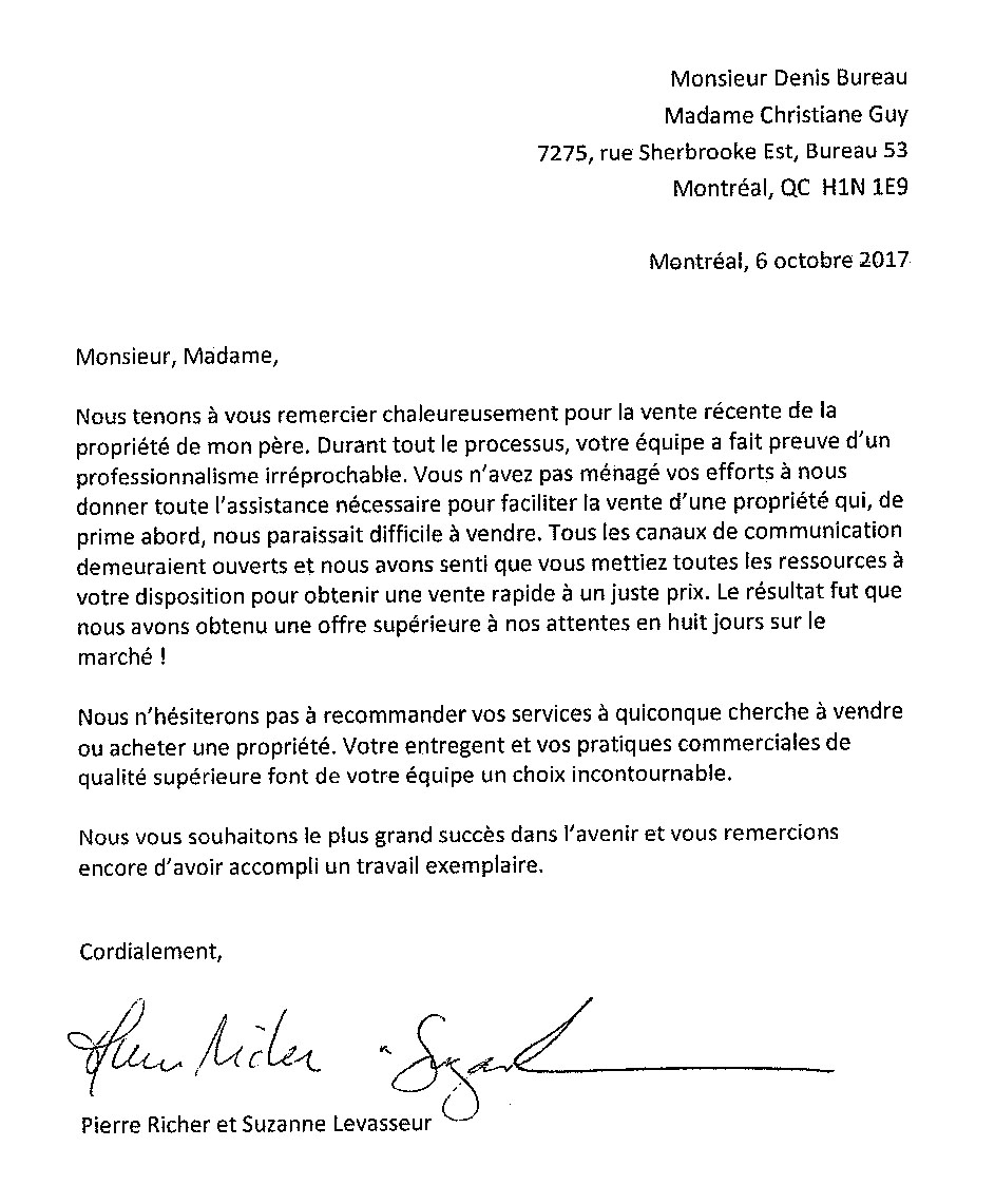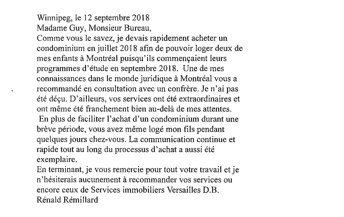 - « Nous tenons à vous remercier les courtiers Christiane Guy & Denis Bureau pour leur grande disponibilité, générosité et leur professionnalisme à l'occasion de la vente de notre condo (402) de la phase III des Jardins Versailles. Ils ont rejoints notre acheteur potentiel aux Îles-de-la-Madeleine dès que nous les avons avisés que notre condo était à vendre et cette vente s'est effectuée en 24 heures. Nous n'hésiterons pas à fournier des références à des futurs clients. »